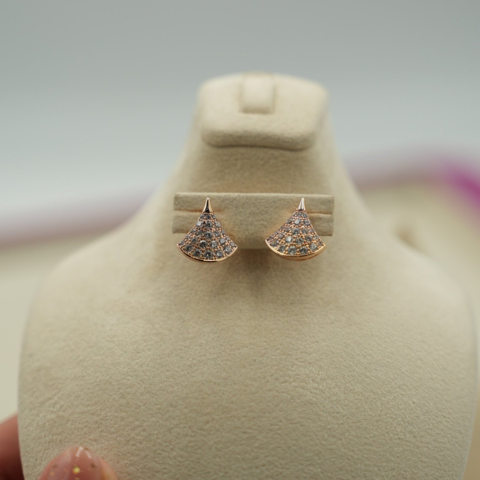 Fan-shaped CZ earrings in 18K gold — the Diva design spreads light across a wider surface than traditional studs or drops. The paved zirconia catches and scatters light in a broad arc near the face, creating a halo of sparkle. A sculptural shape that makes a statement without relying on scale alone. Pair the bold shape with the Grand CZ Four-Leaf Clover Necklace Rose Gold at the neckline.