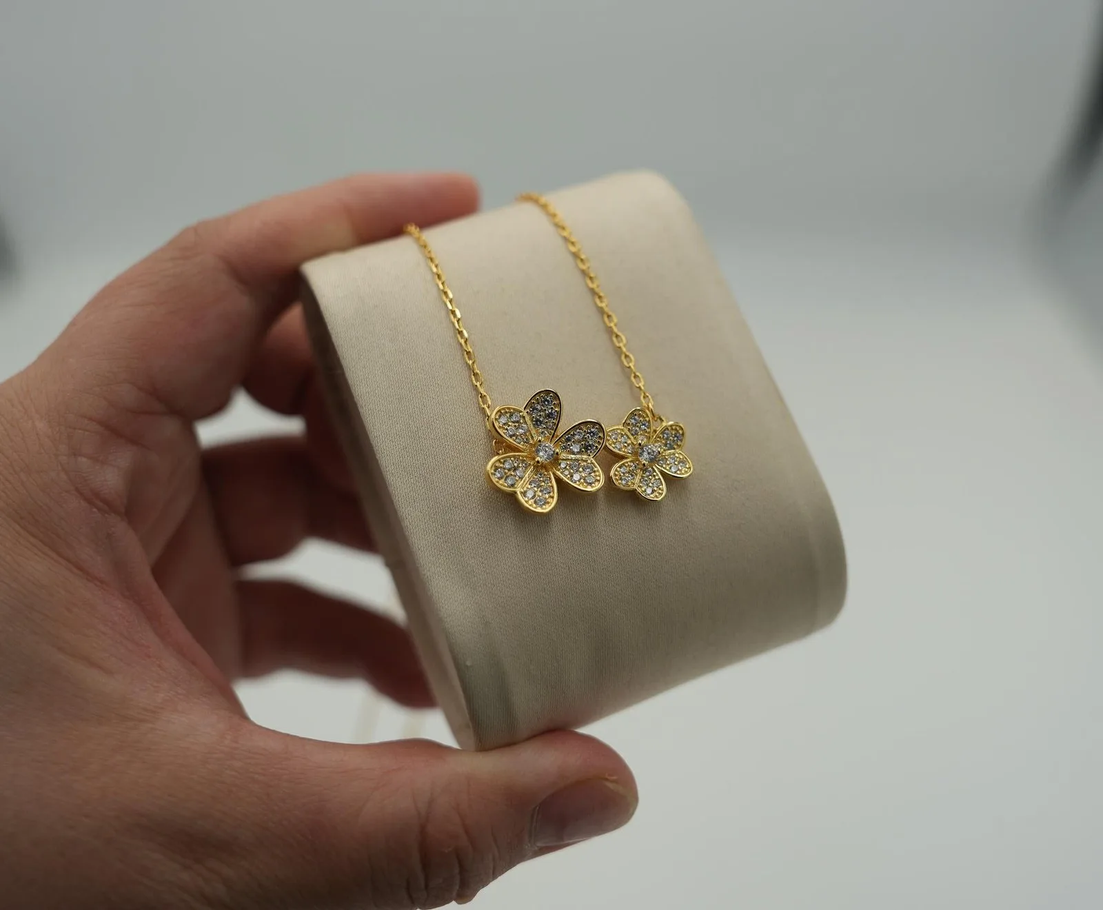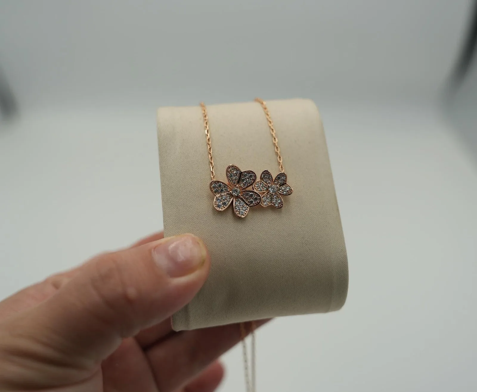 Full CZ paving across three petals on a 16.5-inch gold chain — concentrated floral shimmer at a single pendant point. Available in gold, white gold, and rose gold finishes, each shifting the sparkle temperature differently. The single-pendant design keeps the neckline clean with one focal point of light. Bring the bloom to the ear with the Petal Hoop Earrings Rose Gold.