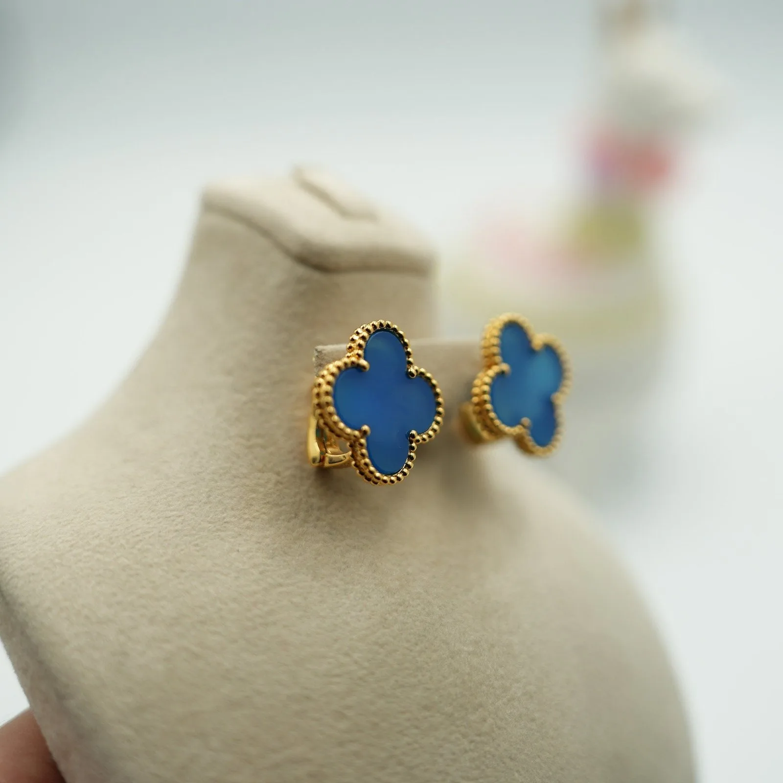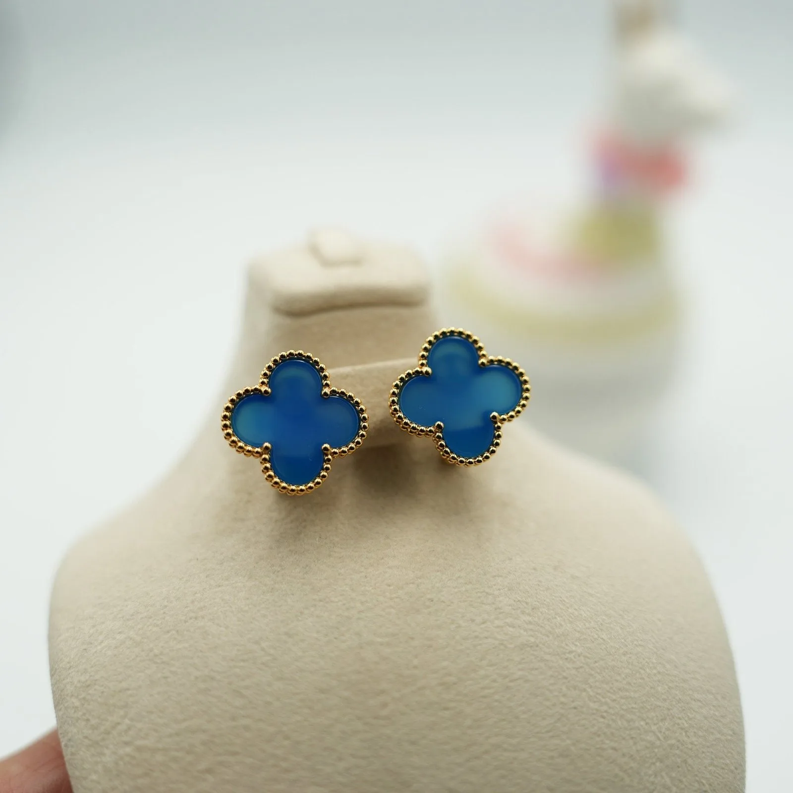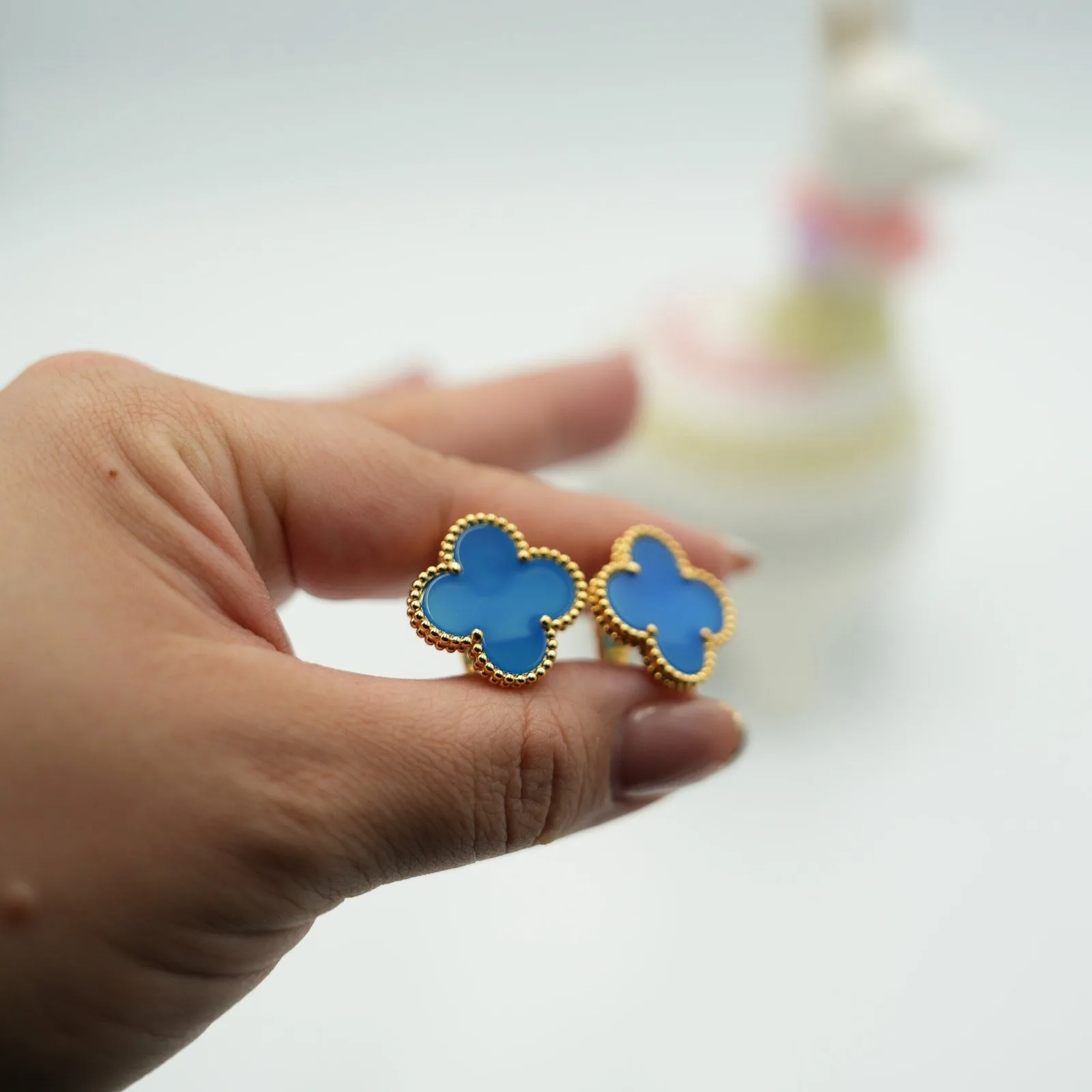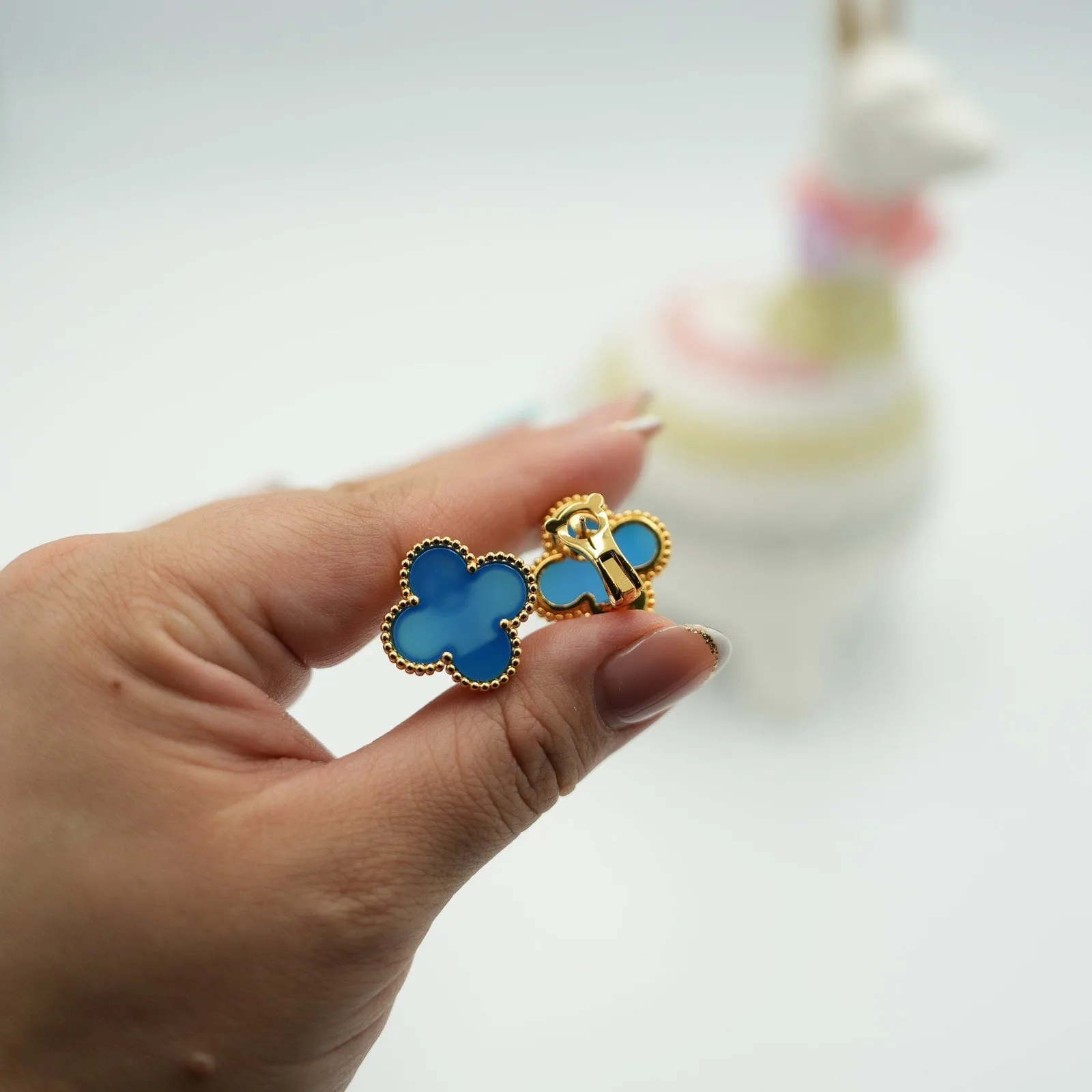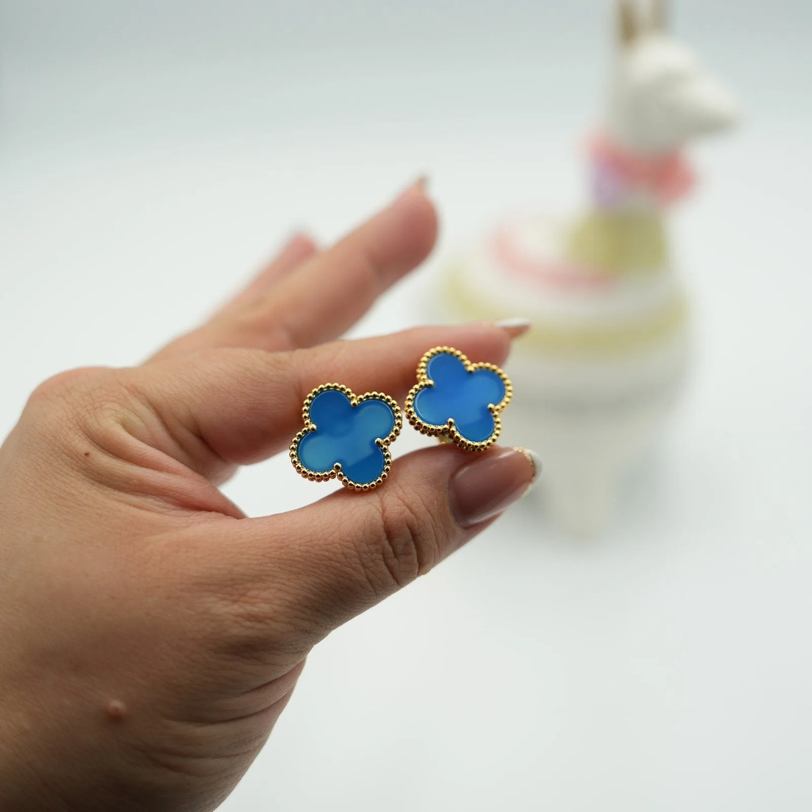 Blue agate magic stud at 20mm — oversized enough that the stone's concentric banding is visible from conversation distance. Push-back post, 18K gold-plated brass, CZ border. The banded blue shifts between gray and periwinkle depending on nearby light. The banding in agate is a geological timestamp — millions of years compressed into wearable rings. Pair with the Blue Agate Clover Necklace – 10 Motif for blue agate at both ear and collarbone.