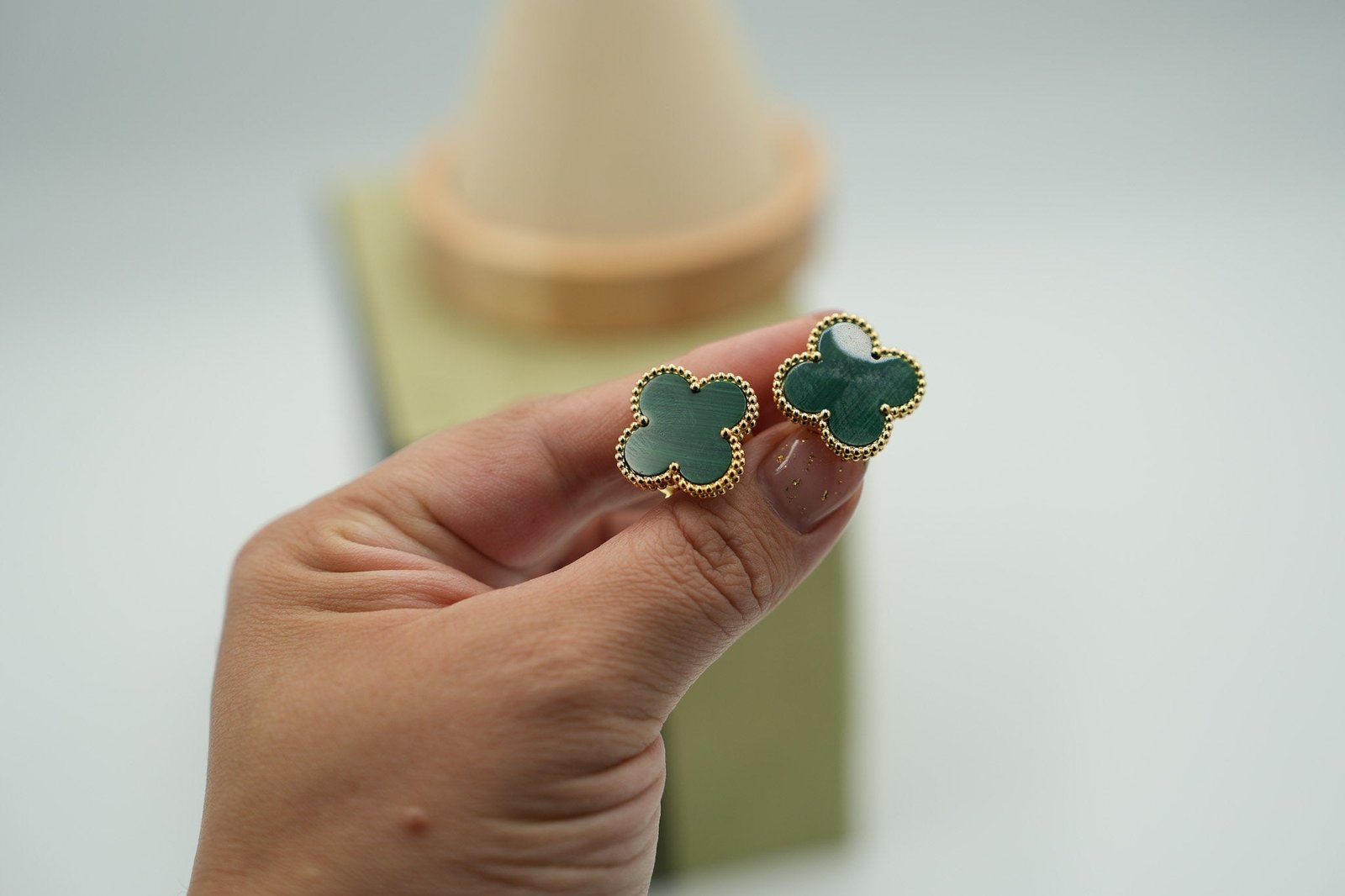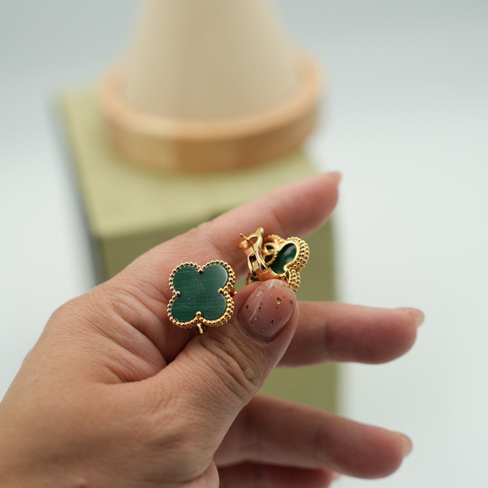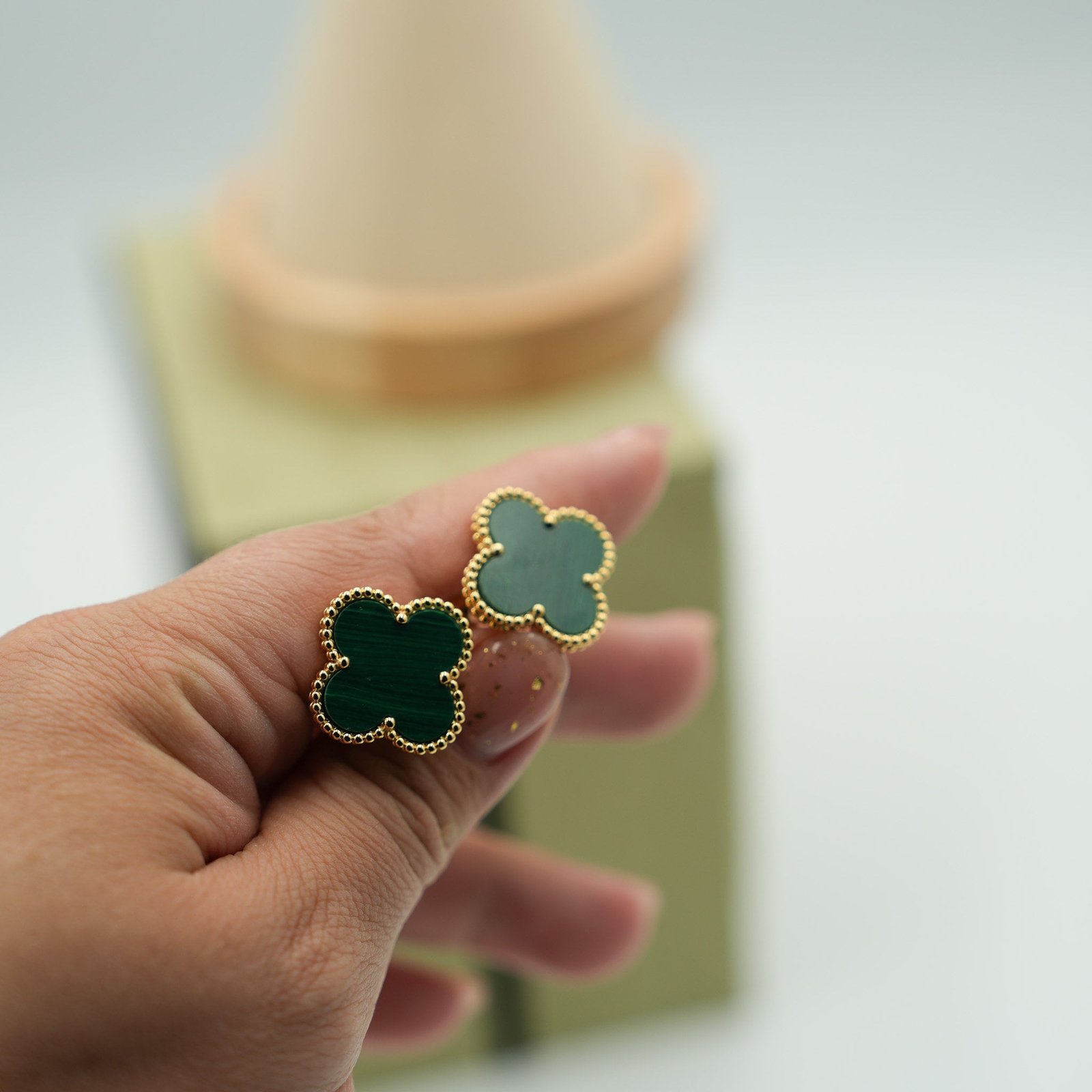 Malachite magic stud at 20mm — oversized clover face gives the stone's concentric green spirals room to hypnotize at close range. Push-back post, 18K gold-plated brass, CZ border. Each piece carries unique banding that no other earring duplicates exactly. At this scale, the malachite's hypnotic spiral banding becomes genuinely mesmerizing at conversation distance. Pair with the Malachite Clover Necklace – 16 Motif for malachite running from ear to waist.