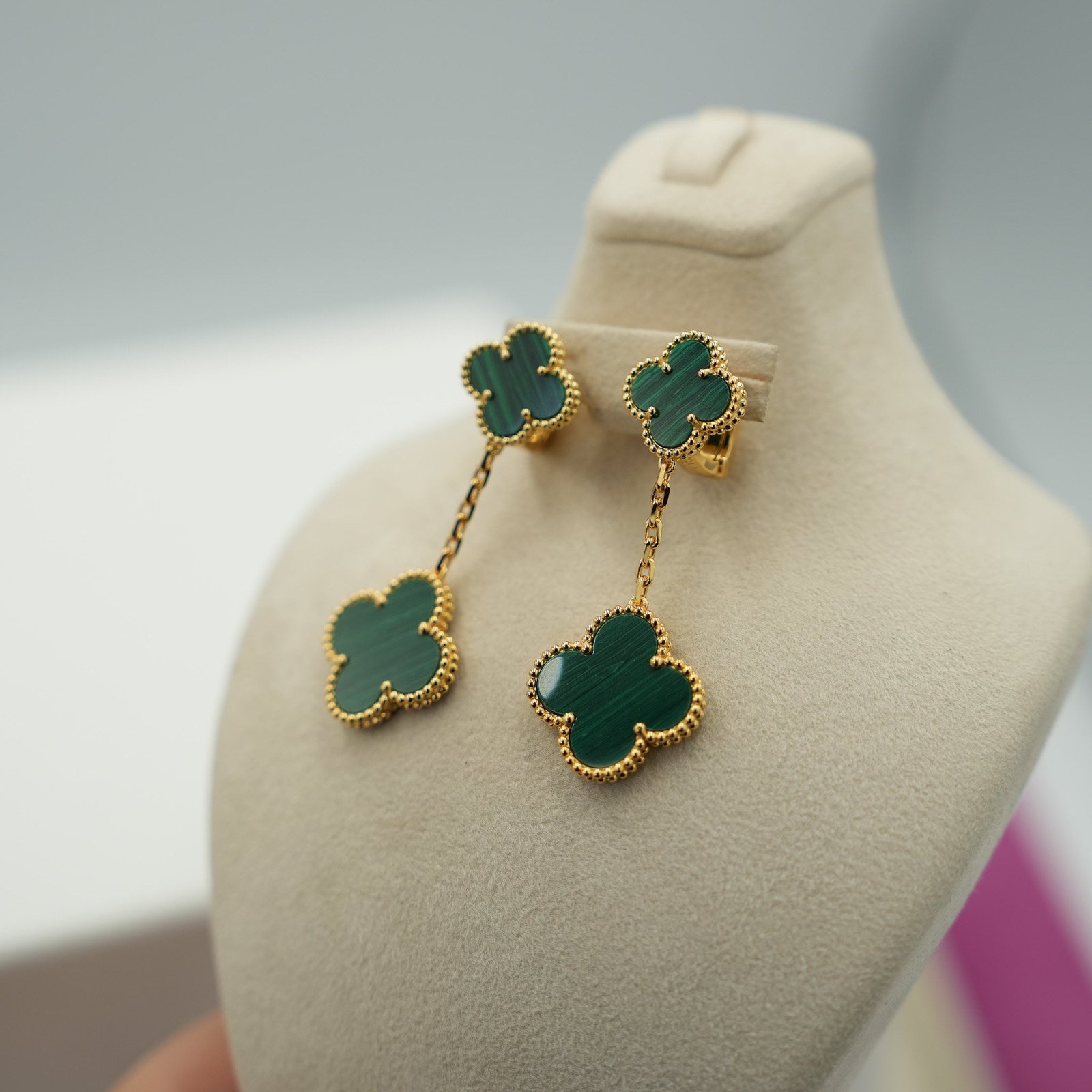Malachite Clover Drop Earrings – 2 Motif Gold