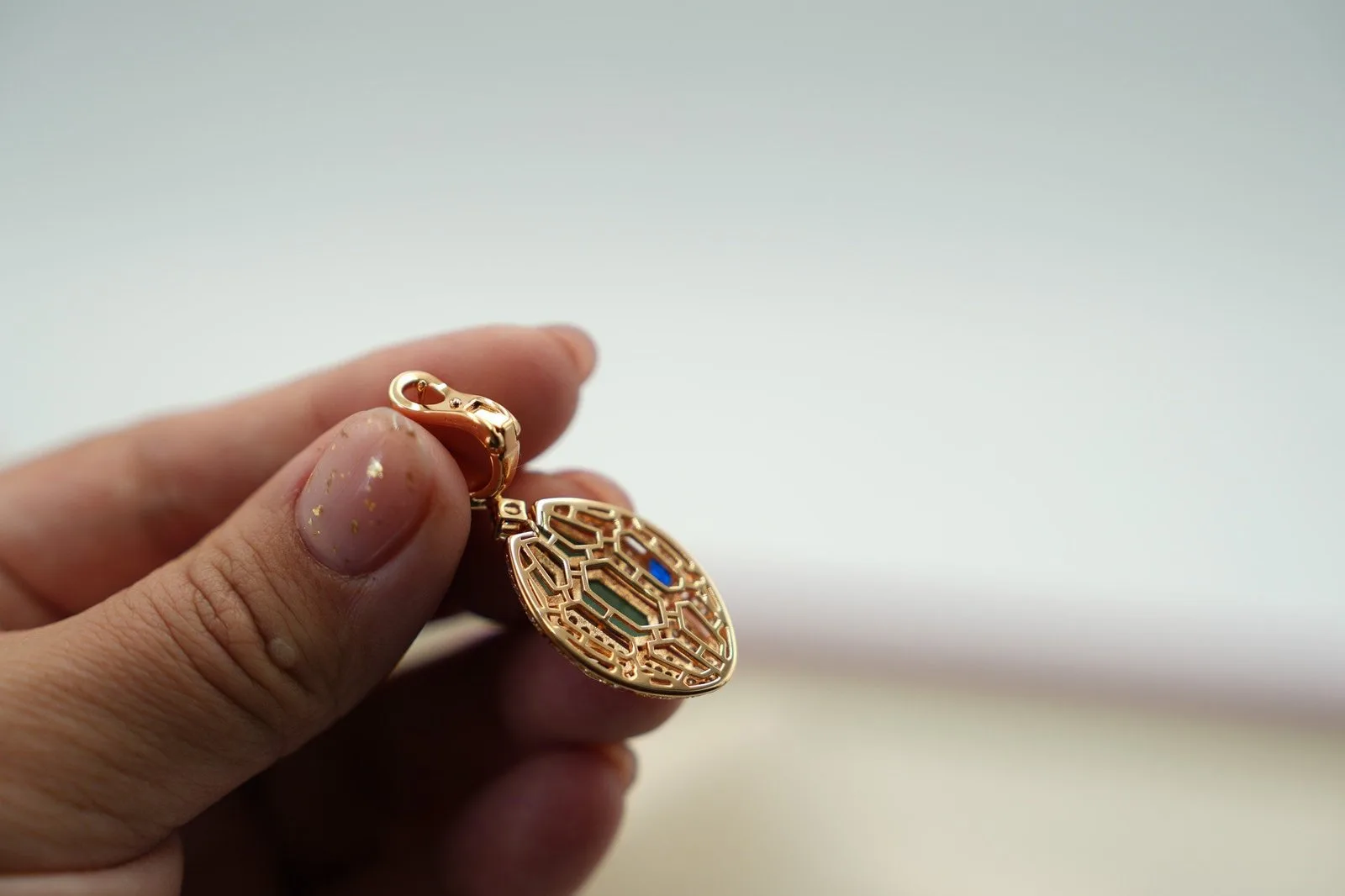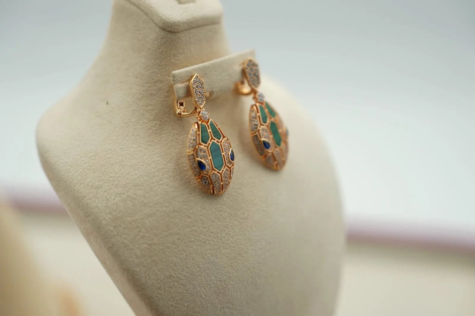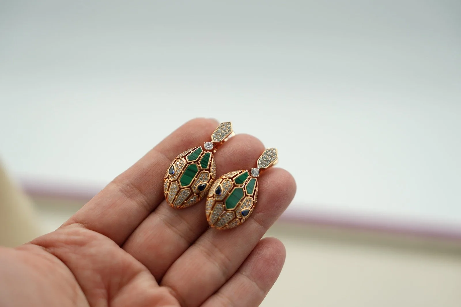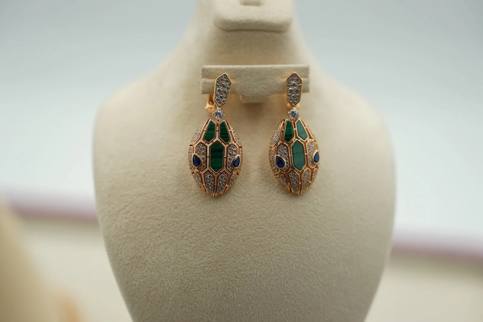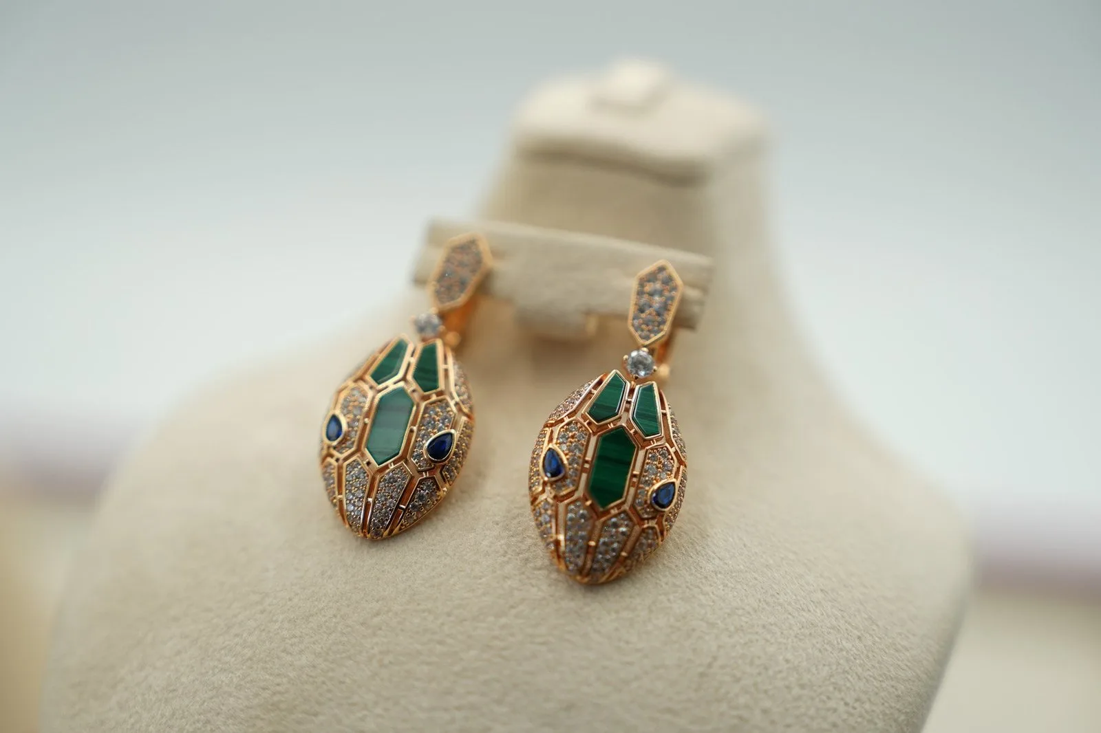 Green malachite eyes peer from gold-plated viper heads — each stud carries the banded mineral pattern unique to its stone. 925 silver with 18K gold plating, push-back posts that sit flush against the lobe for zero wobble. The deep forest-green reads darker indoors and brighter in sunlight, shifting mood with your environment. Let that mineral green cascade to the chest with the Malachite Serpent Pendant Necklace Rose Gold.