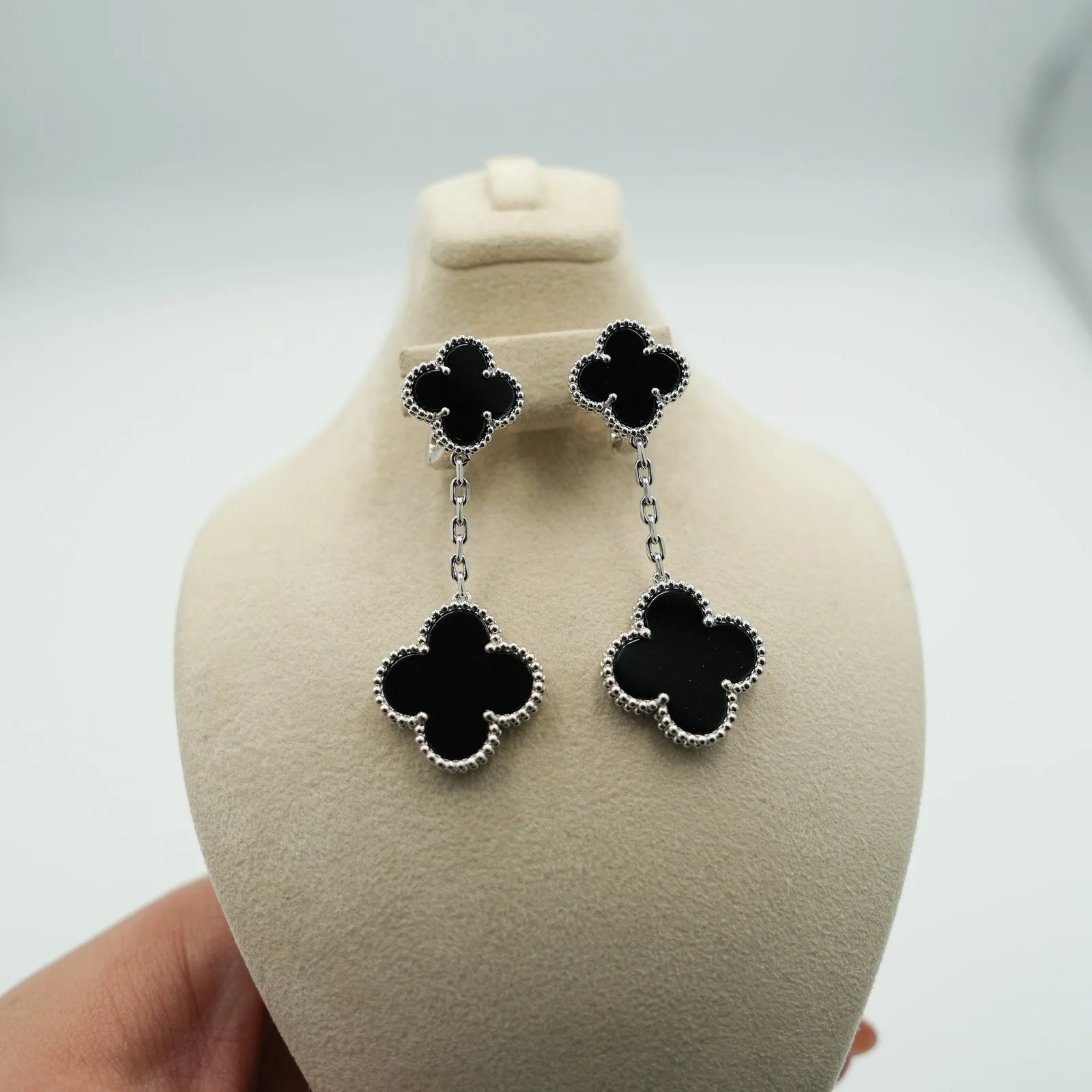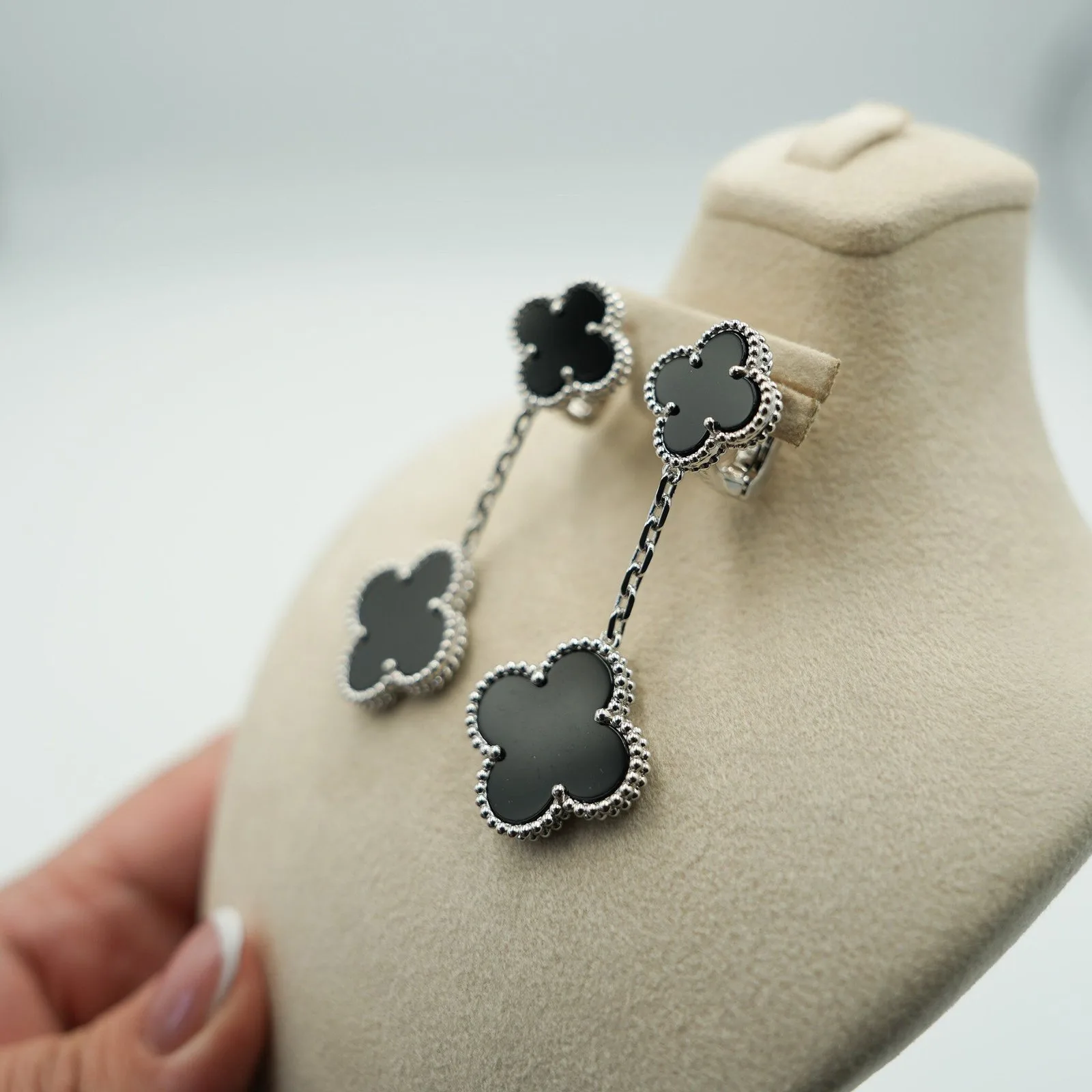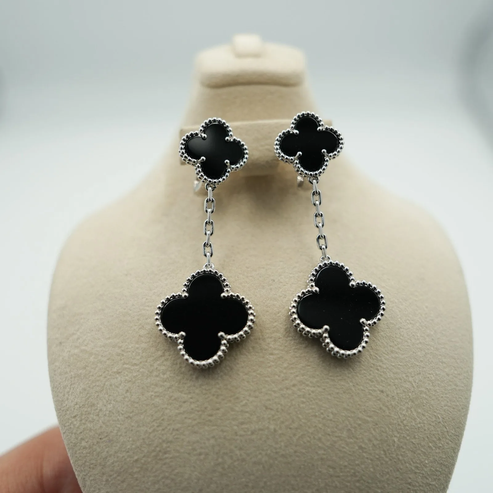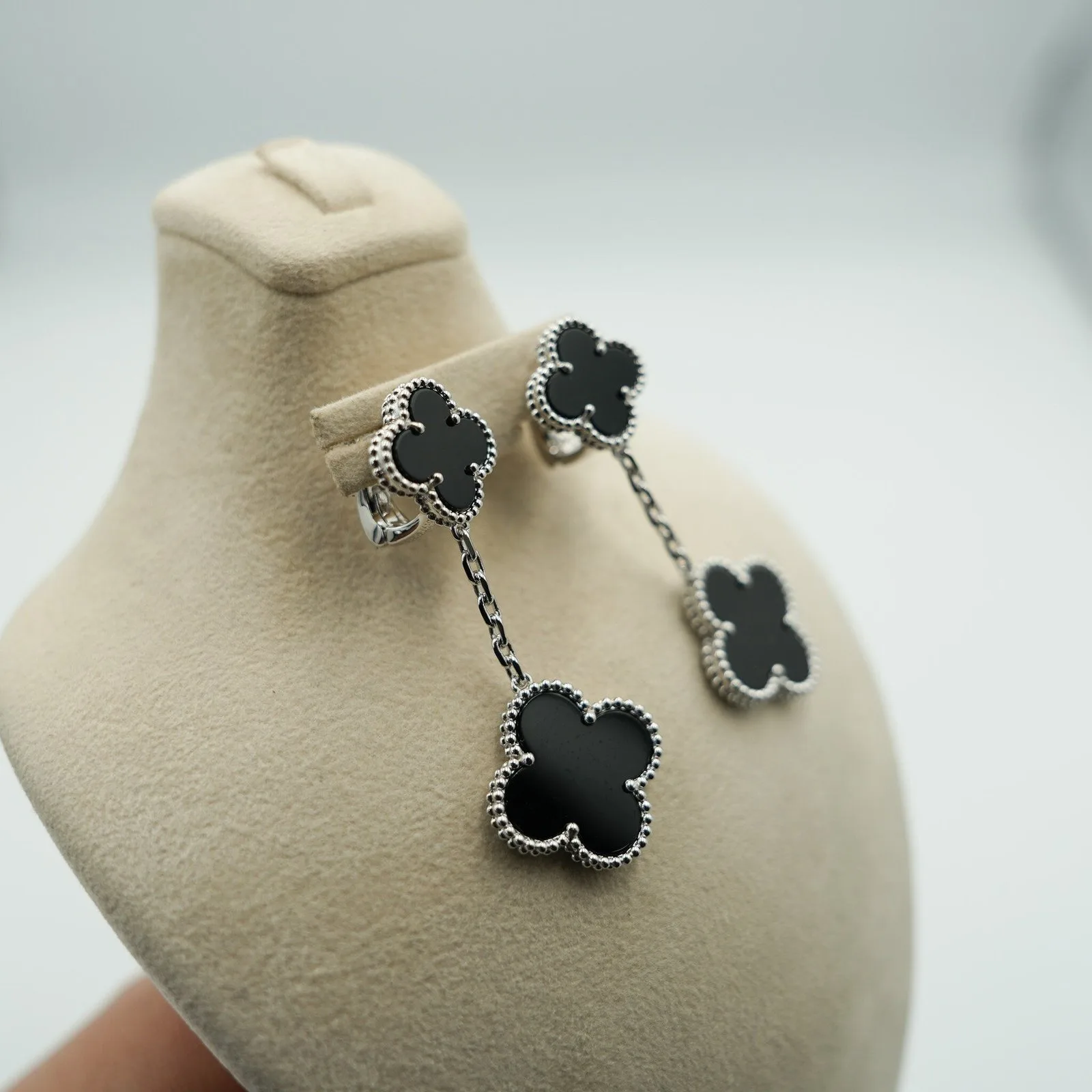 Jet-black onyx paired with 18K white gold — high contrast that reads sharp from across the room. Two clover motifs per stud with push-back posts, the polished obsidian-dark faces catching every nearby light source as a mirror flash. Compact enough for daily wear but bold enough for evening. Anchor the neckline in dark polish with the Onyx Clover Necklace – 10 Motif.