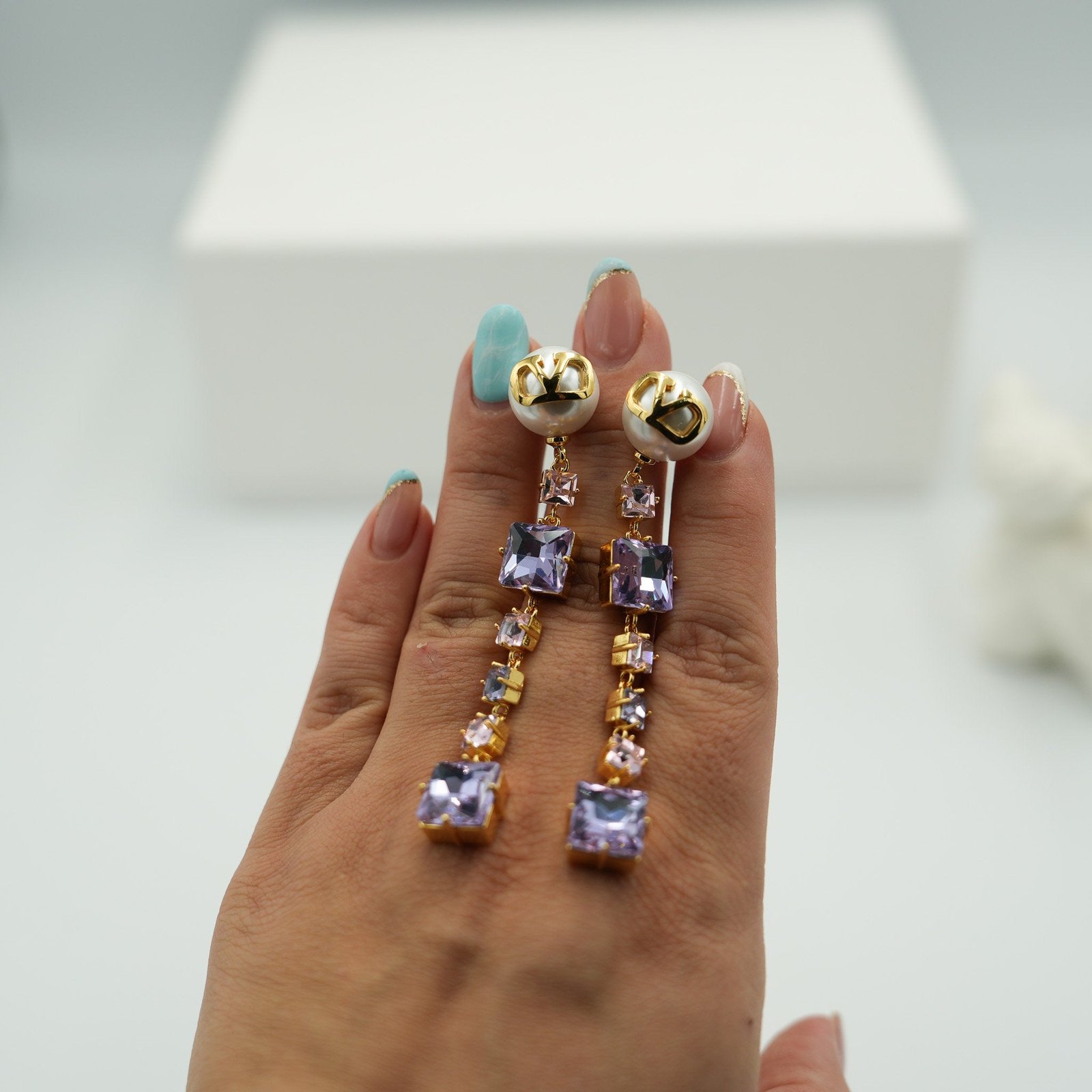 Pearl-tipped geometric drops that swing 7.5cm below the lobe — the length creates dramatic vertical movement with every step. Stud-post back anchors the geometric frame while the pearl sits at the lowest point, catching light like a pendulum weight. The gold metalwork above the pearl adds structured geometry that contrasts with the soft, organic sphere at the bottom. Pair that shell-sphere glow with a winged pendant at the chest — the Mother of Pearl Butterfly Necklace Gold.