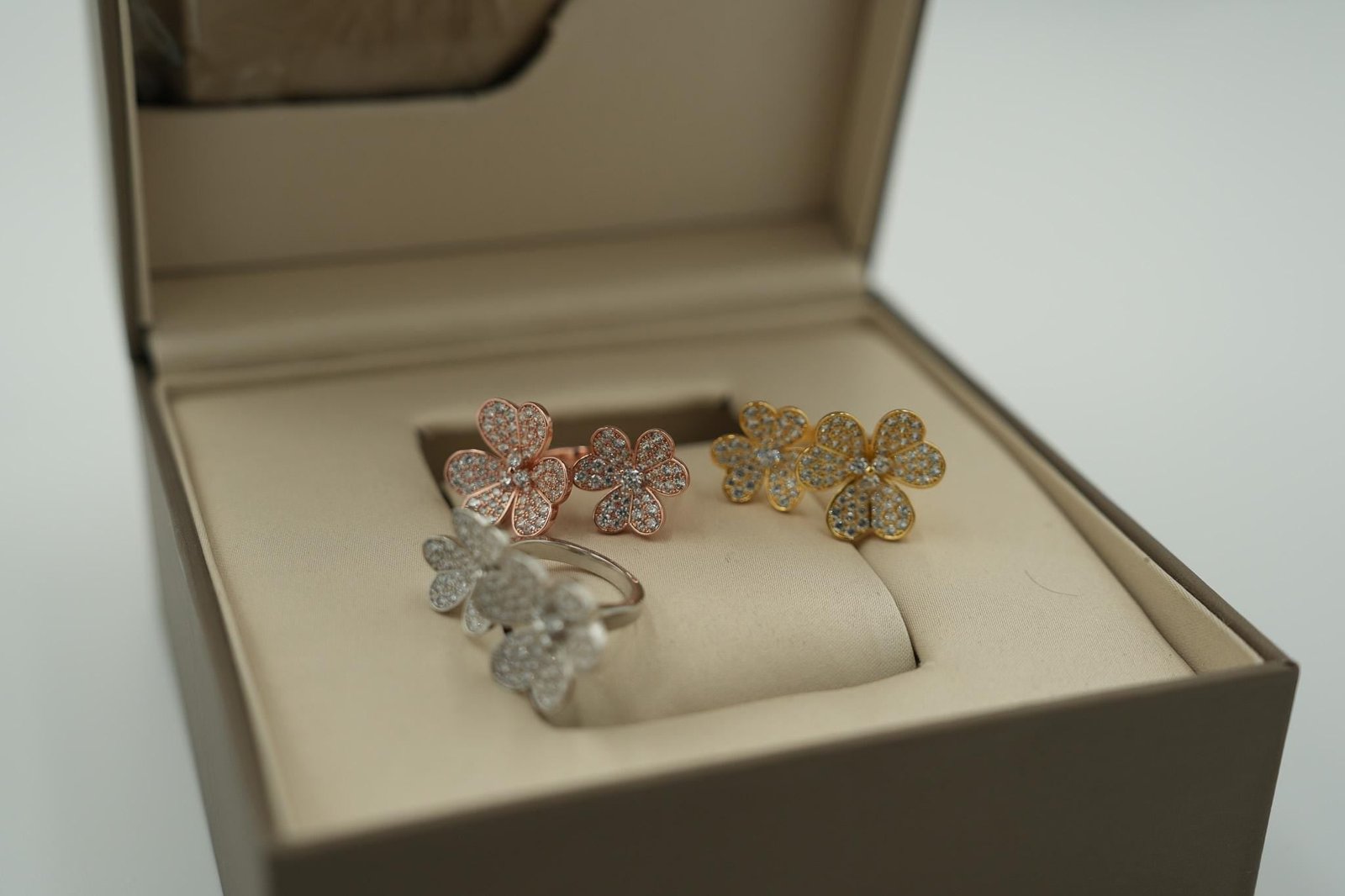 Two three-petal flowers face each other across an open band — fully paved CZ on both blooms, adjustable for US sizes 6 to 8. The between-the-fingers design means the flowers sit at the knuckle and base, framing the finger like a garden trellis. 18K gold plating, the dual-flower arrangement creates a mirror effect that reads as one continuous floral piece. Repeat that petal geometry at the lobe with the Petal Stud Earrings Gold for a coordinated bloom.