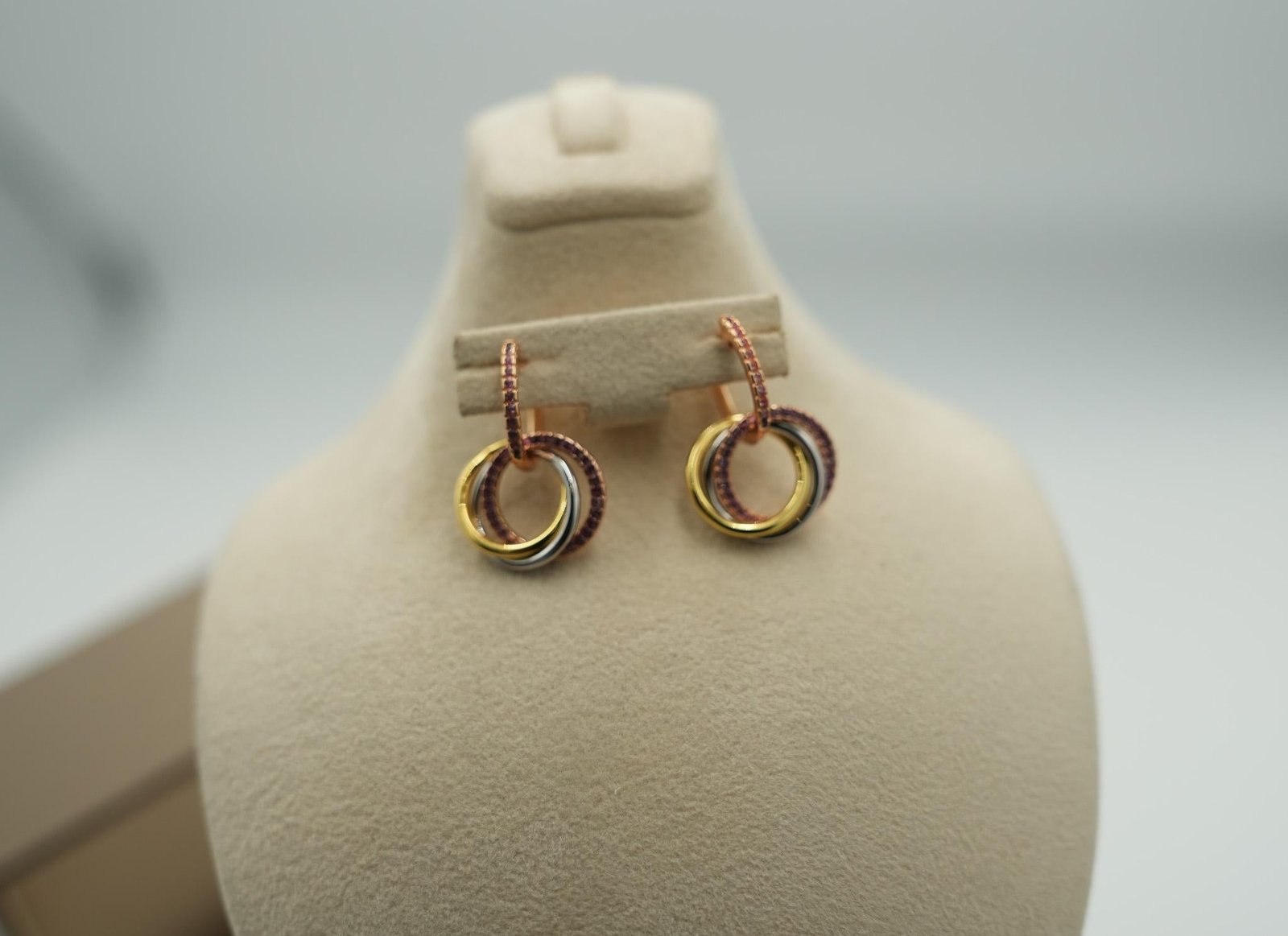 Trinity hoop earrings with deep sapphire CZ accents — the blue stones glow against 18K gold like ink dropped into warm gold. Huggie-style hoops with interlocking circles, the sapphire adds a jewel-toned depth that clear CZ versions lack. The blue reads richer in warm indoor light and more electric under daylight, shifting character with your environment. Balance that deep blue warmth with a delicate winged charm — the Butterfly Necklace Gold at the throat.